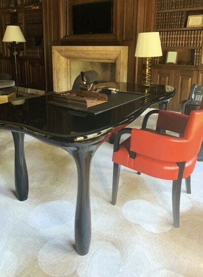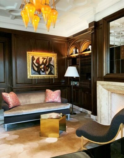 William McIntosh 工作室將這一設(shè)計(jì)理念描述為 "我們很喜歡這座圖書(shū)館的英式巴洛克風(fēng)格,但我們非常時(shí)尚的客戶希望它更加精致,更有藝術(shù)感。我們的答案是,將經(jīng)典的路易十六風(fēng)格正式座椅與雕塑椅、漆面書(shū)桌和現(xiàn)代手工簇絨地毯搭配在一起。您的圖書(shū)館應(yīng)該是一個(gè)能激發(fā)您的靈感,讓您的精神和心靈得到恢復(fù)的地方。我們的目標(biāo)就是為客戶營(yíng)造這樣一種氛圍"。